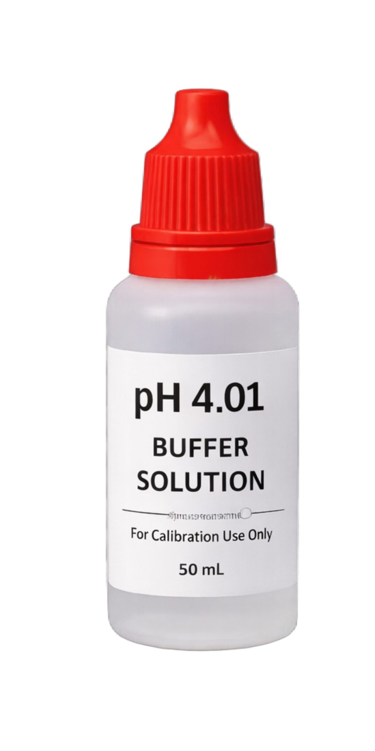 This 50 mL pH 4.01 buffer solution is supplied as a replenishment bottle for Meascom Australia calibration kits and water quality systems.