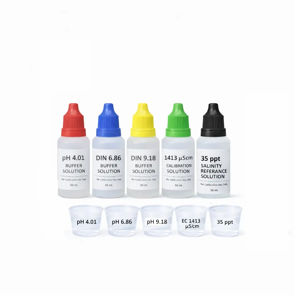 The pack includes 50mL bottles of the commonly used pH 4.01, pH 6.86 and pH 9.18 buffer solutions along with a 50mL bottle of 1413 µS/cm conductivity and 35 PPT salinity calibration solution, allowing users to perform routine calibration quickly and confidently.